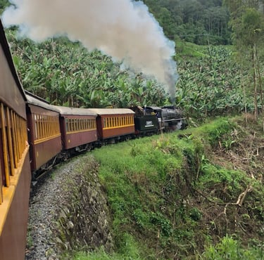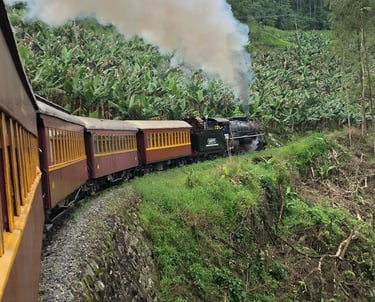 Entre o charme de um trem do século passado e a beleza exuberante da natureza, cada instante se transforma em uma lembrança especial.